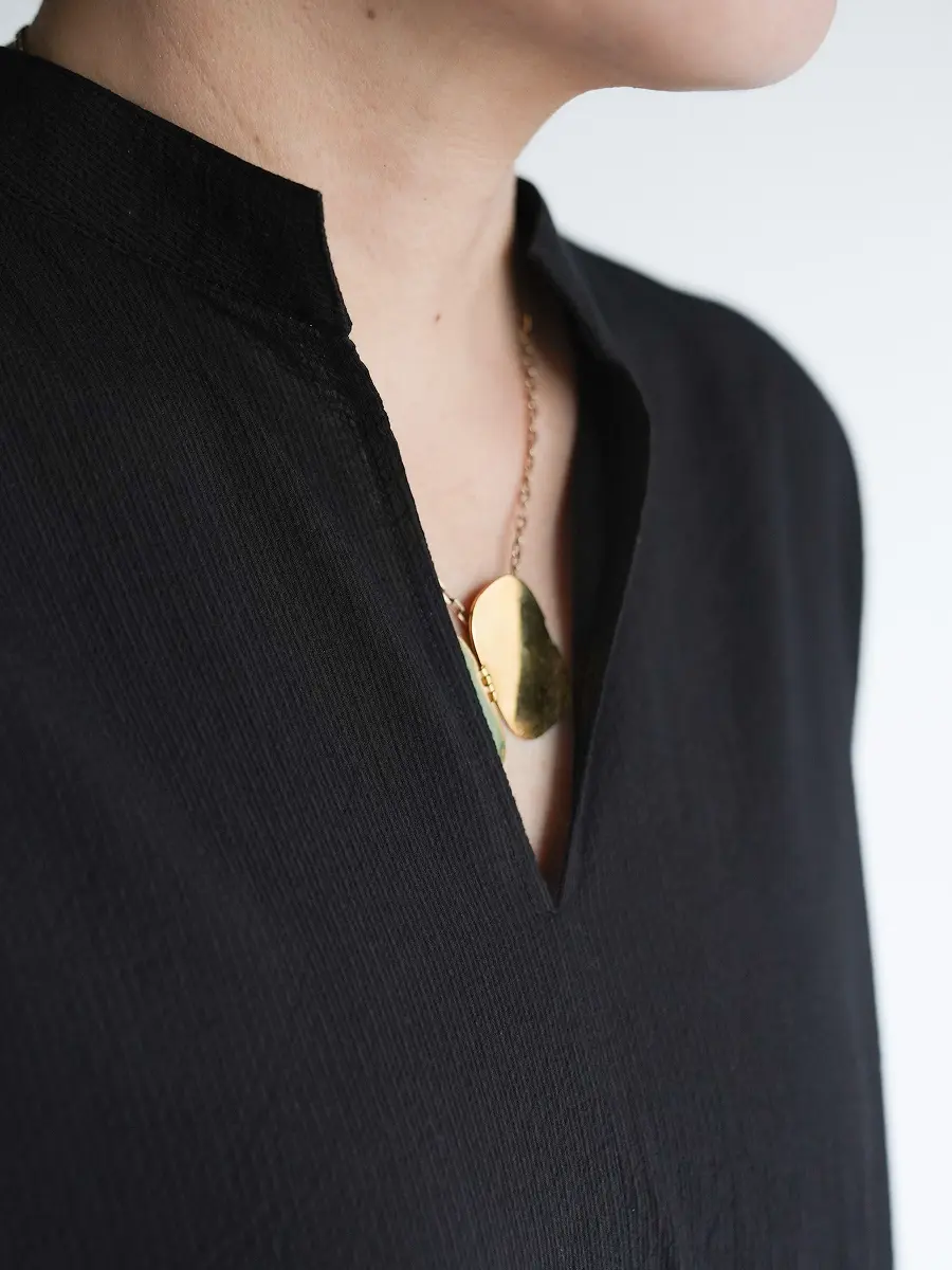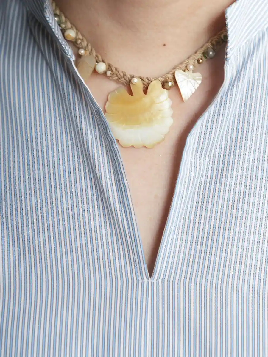 今回、家の中を探していたら、 母がよくつけていた貝殻のネックレスを見つけたんです。 それを使いたいなぁと思って。 特に、若い頃のメリル・ストリープの スタイルがすごく好きなんですが、 彼女がラフなシャツ地のドレスに 貝殻のモチーフのネックレスを合わせていたのを 思い出して‥‥ それにインスパイアされたのかもしれません。