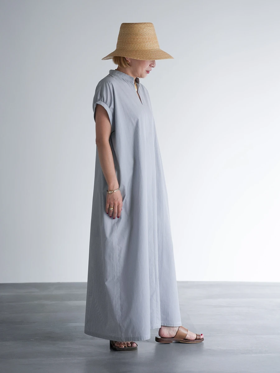 今回着た〈O2〉のワンピースは、 素材の違いが楽しめるデザイン。 チャコールとストライプの2色、 サイズ違いでどちらも袖を通してみました。