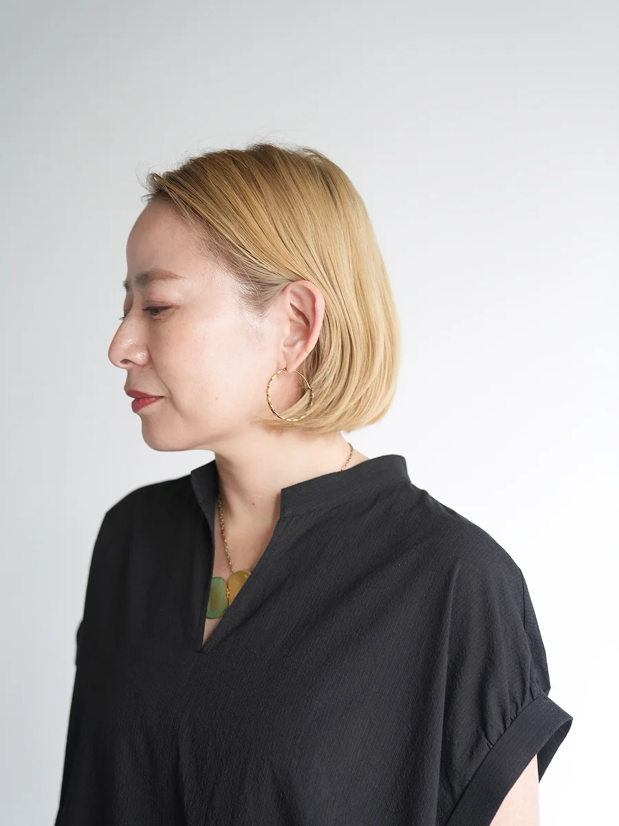 ピアスはすこし大ぶりのフープに、ネックレスも コンテンポラリーな雰囲気のあるものを選んでいます。