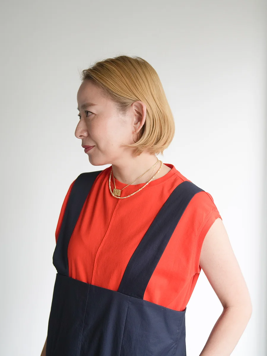 色はネイビーを選んで、最初は白Tやボーダーなど 定番のトップスも思い浮かべたのですが、 年齢を重ねるにつれて、 もっと色との組み合わせにも挑戦したくなって。 そんな気持ちもあり、 今まで遠ざけていたオレンジを選んでみました。 ちょうどNikkiでも落ち着いたトーンの オレンジTシャツが出ていて、袖のデザインも フレンチとノースリーブの中間のような形だったので、 これならサロペットとも相性がよさそう! と思って、合わせてみました。
