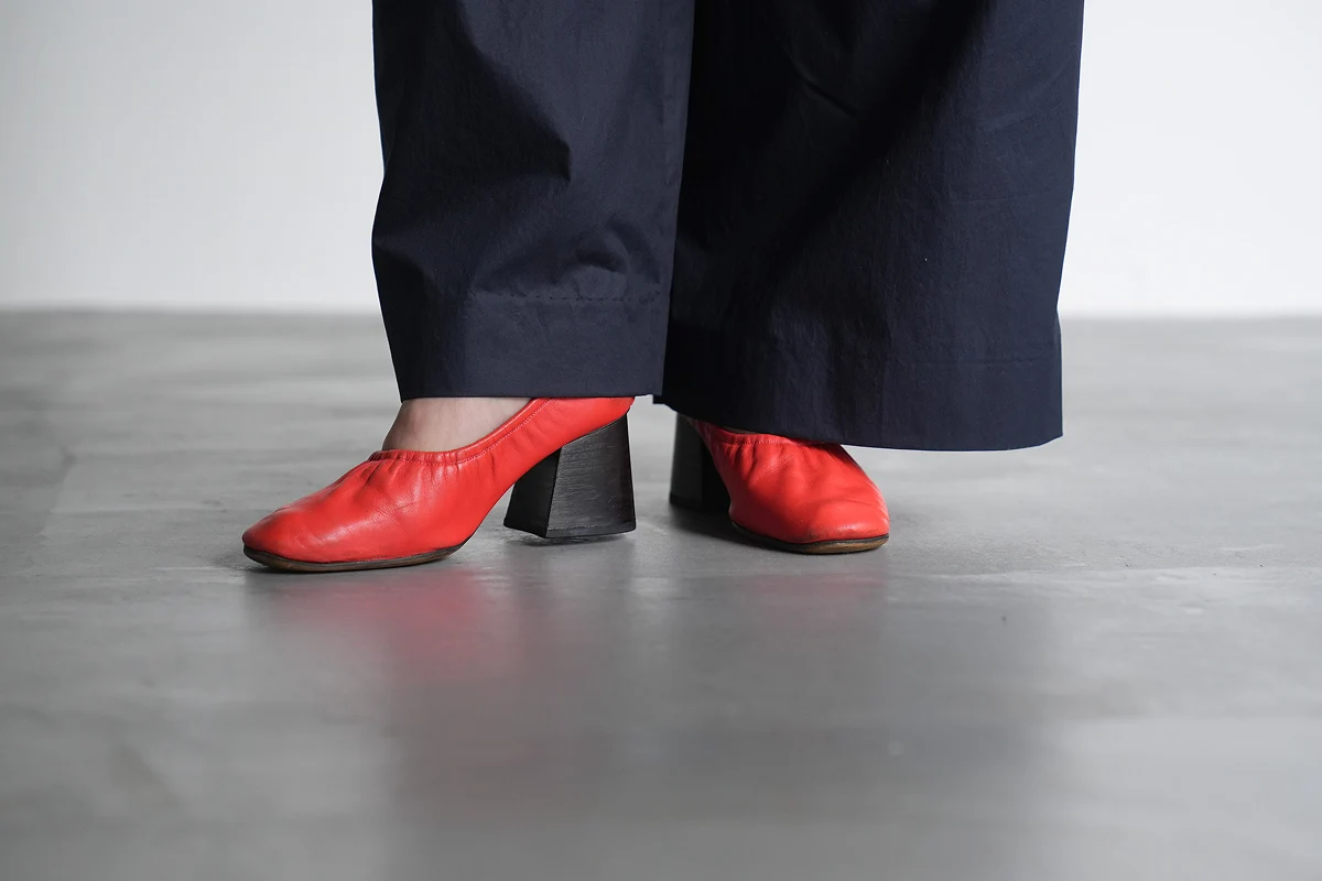ヒールは高めのものを。 私は身長が低いので、 ヒールを履いてバランスを取ることが多いのですが、 それだけじゃなく、ヒールを履くと 自然と背筋がシャンとして、 なんとなく非日常気分を味わえるというか、 ファッションの醍醐味でもある高揚感があるんです。 もちろん歩きやすい靴を選ぶこともありますが、 ワイドパンツやこういった分量感のあるワンピースには、 やっぱりヒールを合わせたくなる。 カジュアルなだけじゃなくて、 ほんのり女性らしさも加えたくなるんですよね。
