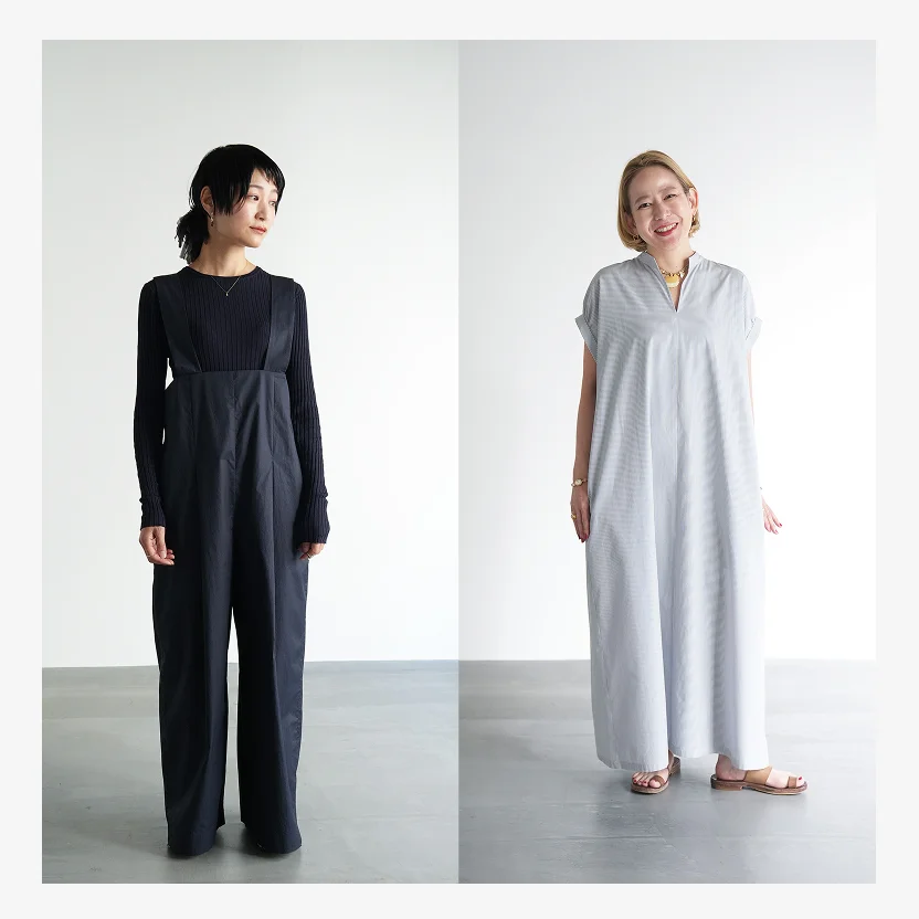 「Nikki ESSENTIAL PIECES (ニッキ エッセンシャル ピーシーズ)」デザイナーの 浅川智子さんに手がけていただいた 「スキッパーロングドレス」と「ドレスサロペット」。 「着ていただきたい方はいますか?」とお聞きしたところ、 浅川さんの口から、あるおふたりの名前があがりました。 そのおふたりに、実際に着ていただいたようすをお届けします。