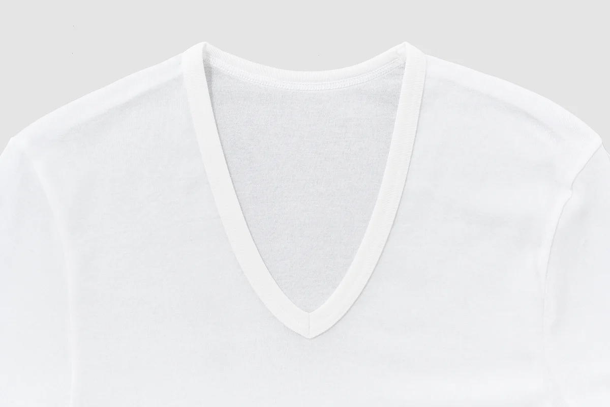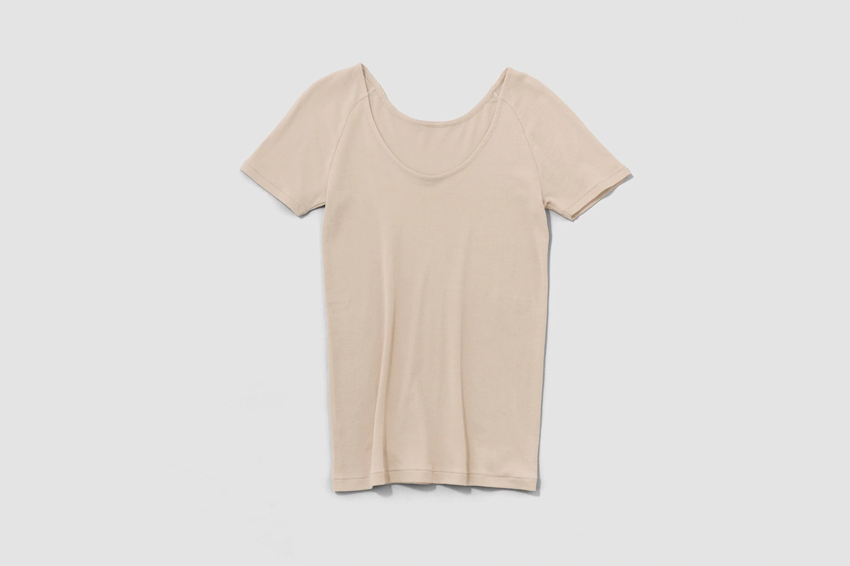 ―― 話題にのぼったドロワースやタンクトップは この春夏も継続して展開しますが、 あたらしいかたちもくわわります。 それがレディスの半袖インナーと、 メンズのVネックTシャツ。 夏はわきの汗ジミが気になるという声があり、 わきをカバーできる ショートスリーブのTシャツをつくりました。