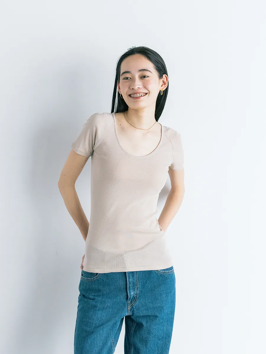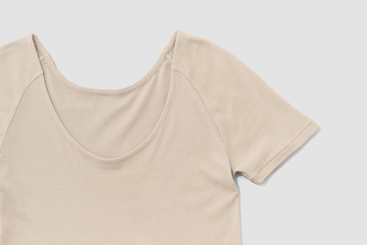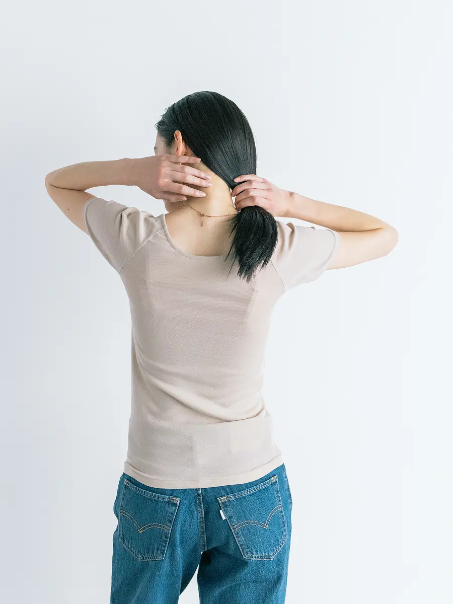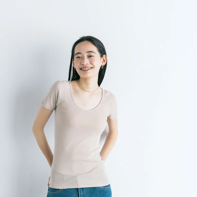 ―― シャツのインナーはもちろん、 Tシャツの中に着ても、 袖や襟もとからはみ出ないようになりました。