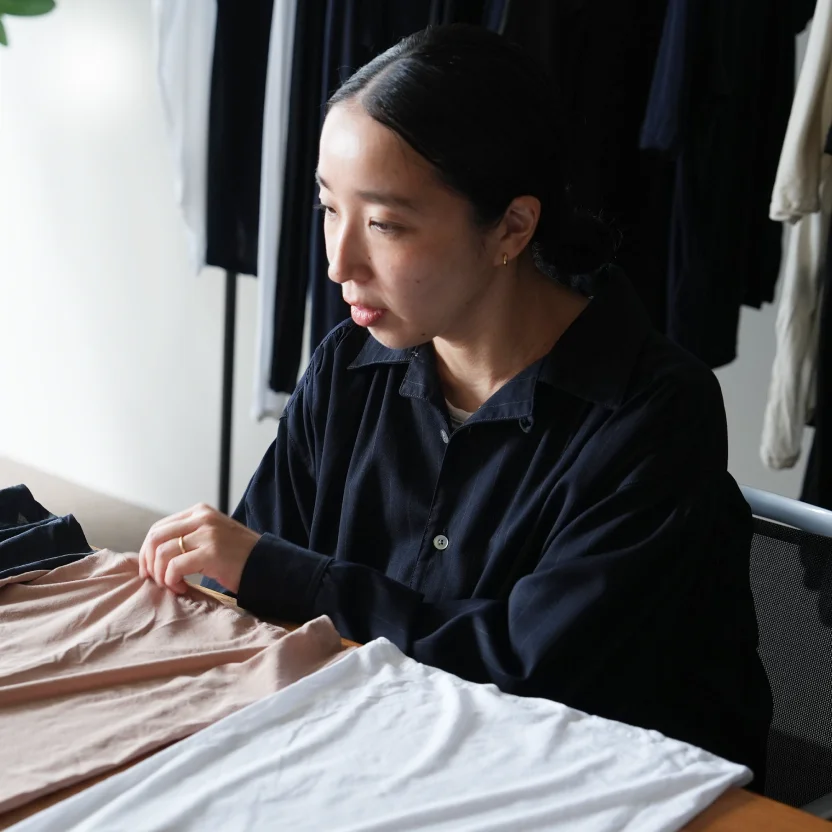 髙品 2019年に〈O2〉のモデル撮影で新島を訪れた際、 フィッティングでFIROのカットソーに ふれたのが最初です。 きれいな生地だな、というのが第一印象で、 実際に着てみたら、着心地もとても良くて 胸がときめいたのをおぼえています。