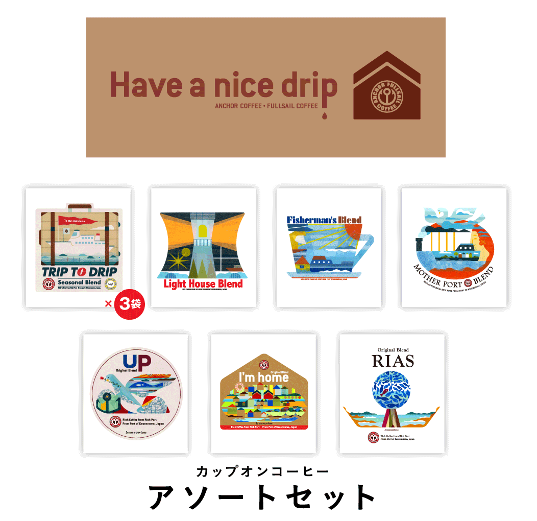 福田利之さんのパッケージイラストによる アンカーコーヒーは、そのままカップオンコーヒーの袋にも。 お湯とカップさえあれば、 オリジナルブレンドの豊かな香りをどこでもたのしめます。 もちろん、オフィスでもお気軽にどうぞ。 今回は「TRIP TO DRIP アントワープ」5袋と、 アンカーコーヒーのオリジナルブレンドを7種類詰めた アソートセットをご用意しました。 かわいいパッケージなので、プレゼントにもおすすめです。