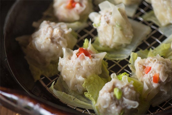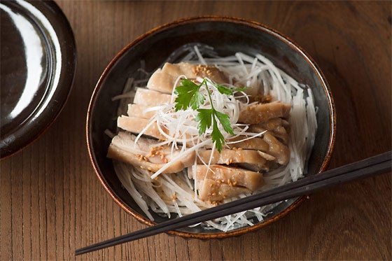 中華スープ、酒、醤油をまぜたタレをかけつつ