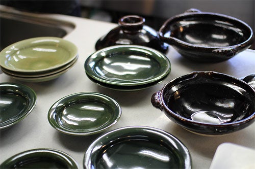 (今回は、黒いアメ釉と、うすみどりの灰釉を