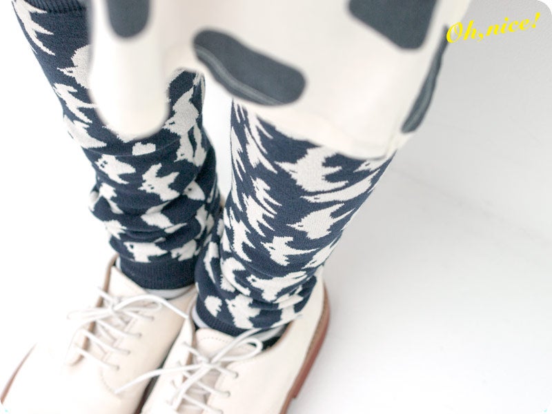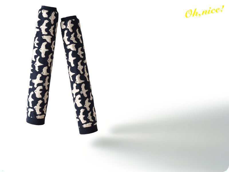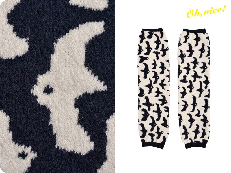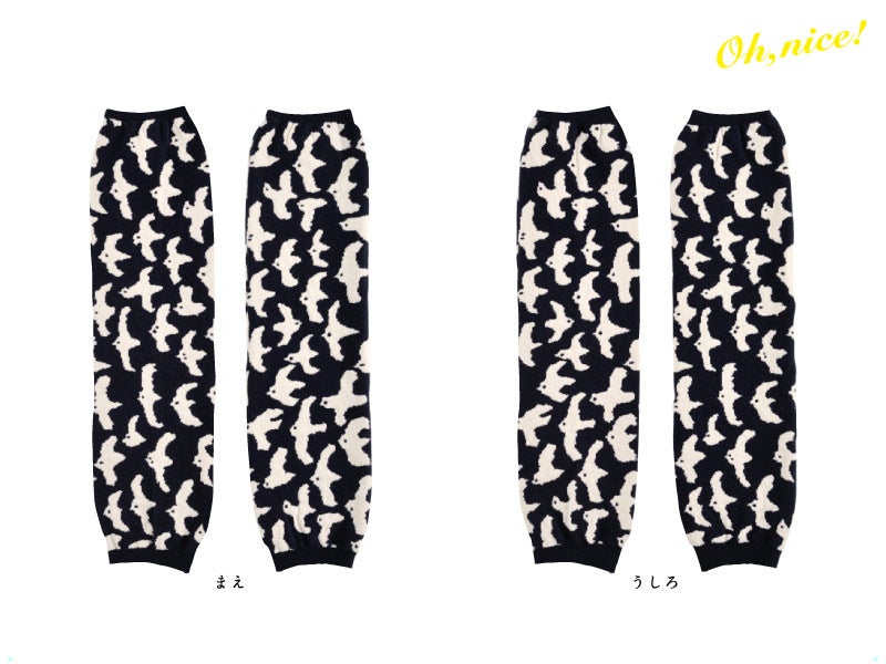 地に、白いトリが群れで飛んでいるような柄の レッグウォーマーです。 素足で出かけた日、 オフィスや学校、外出先で足が冷えることがあります。 そんなときに重宝しますよ。 腕にはめ、アームウォーマーとして使ってもOK。 けいとのぱんつと合わせて、 かわいいルームウェアに、どうぞ。