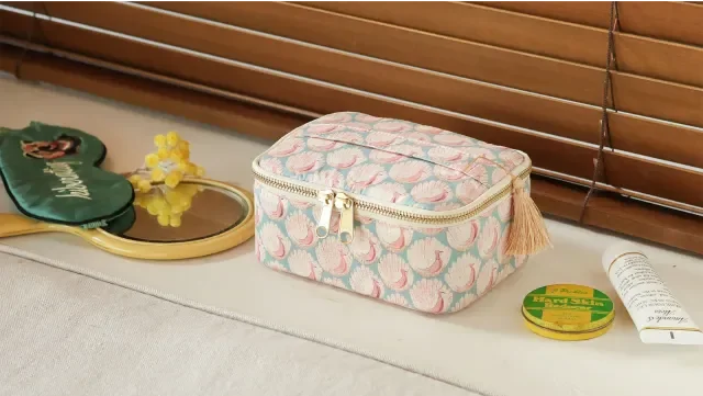 持ち手つきの、箱型ポーチです。