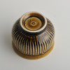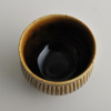 ぷっくりと丸いかたちの湯呑に、鎬のもよう。アメ色の釉は、濃いところは焦げたカラメル、うすいところはキツネ色になりました。くびれたところが指にかかって、手にもちやすい安定したかたちです。