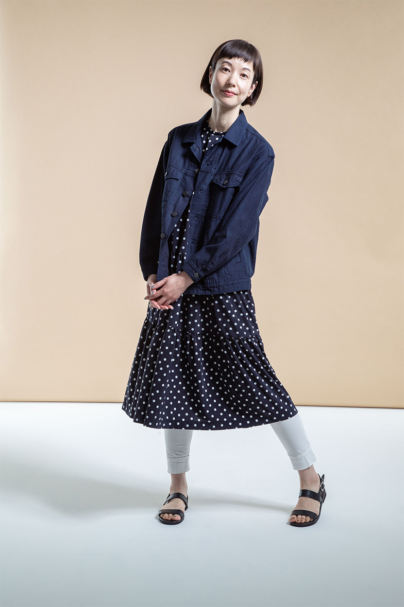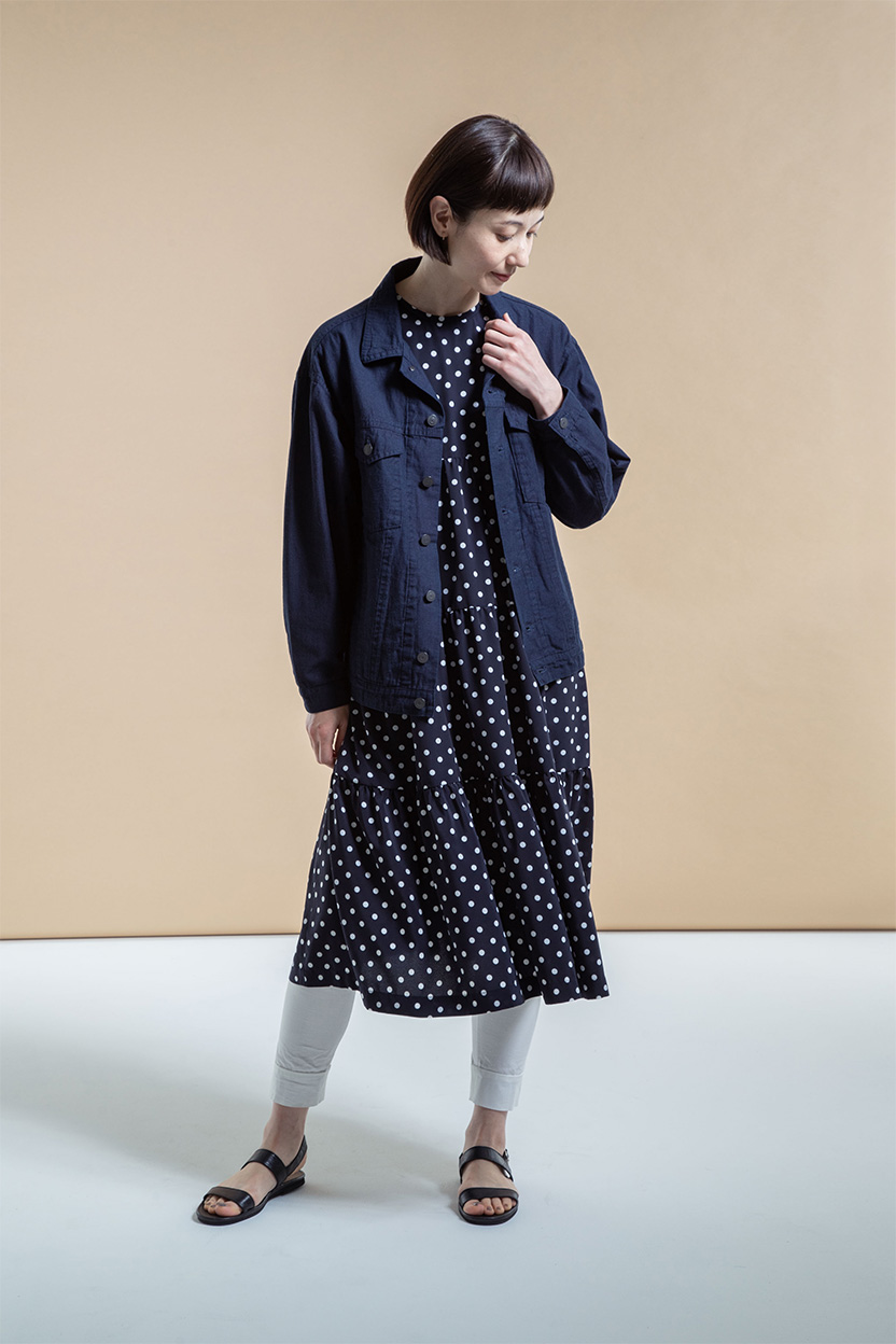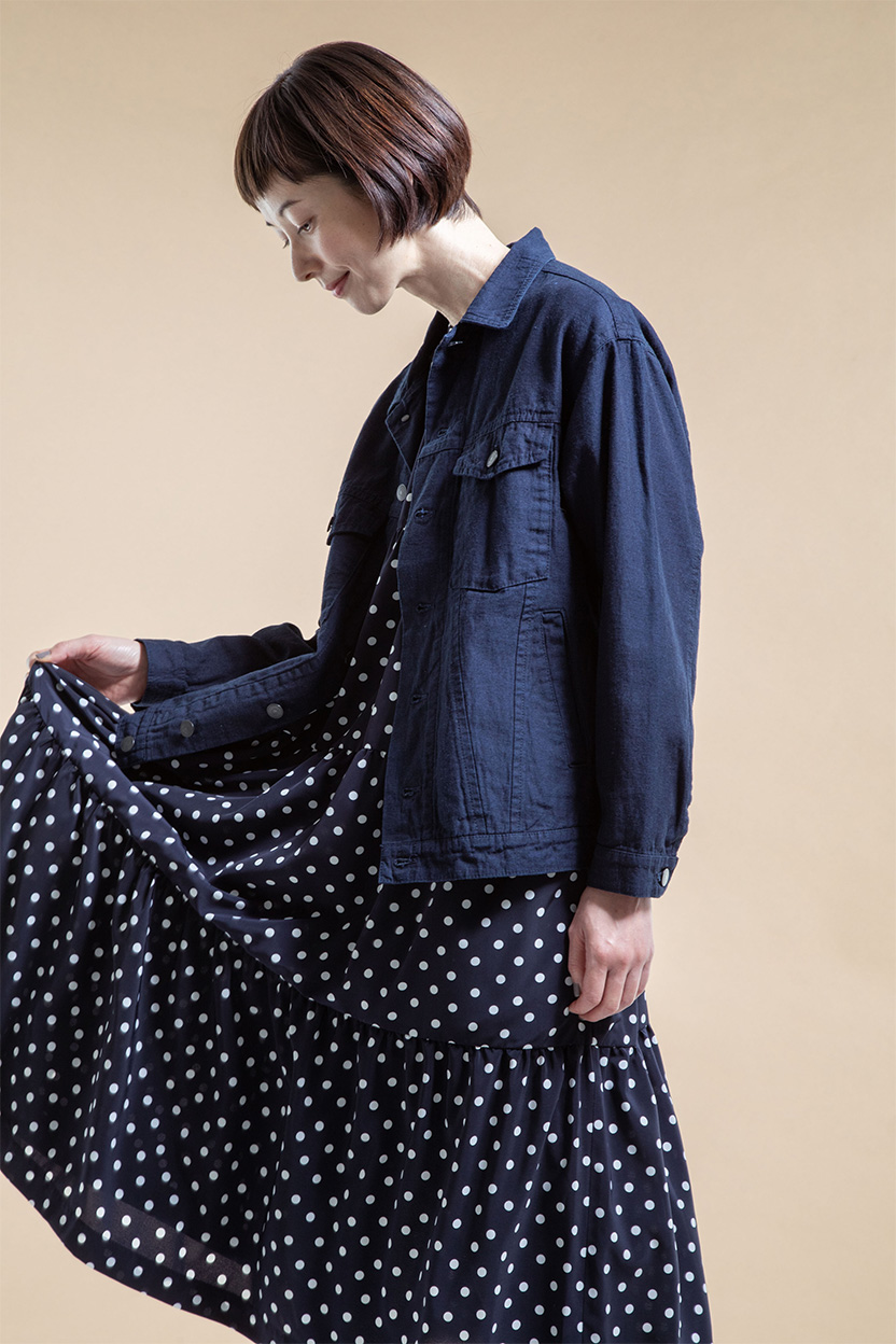 襟なしの首もとと、袖口はパイピングで軽やかに。