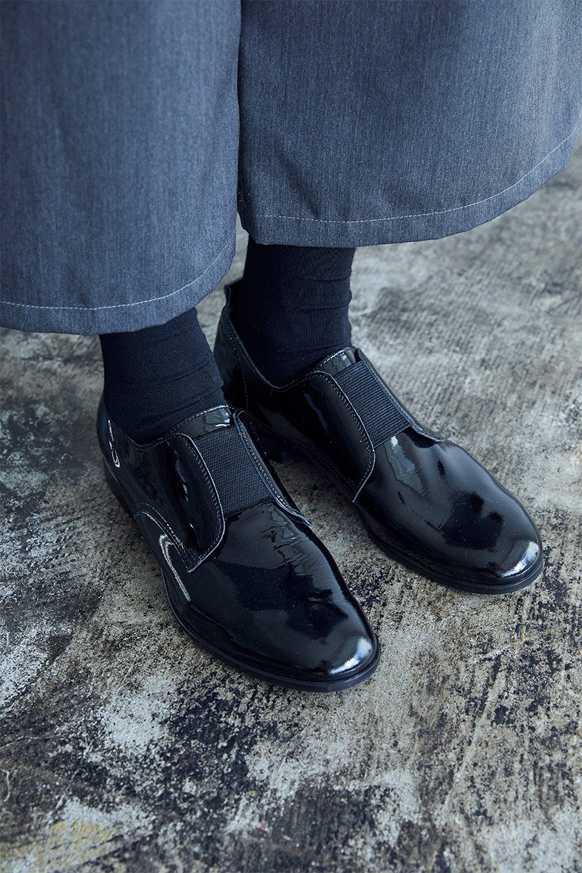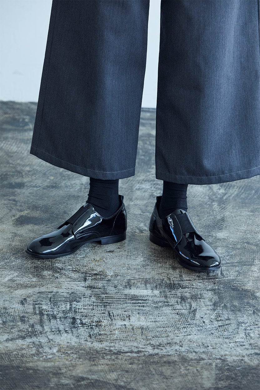 エナメルの光沢が目をひくスリッポン。