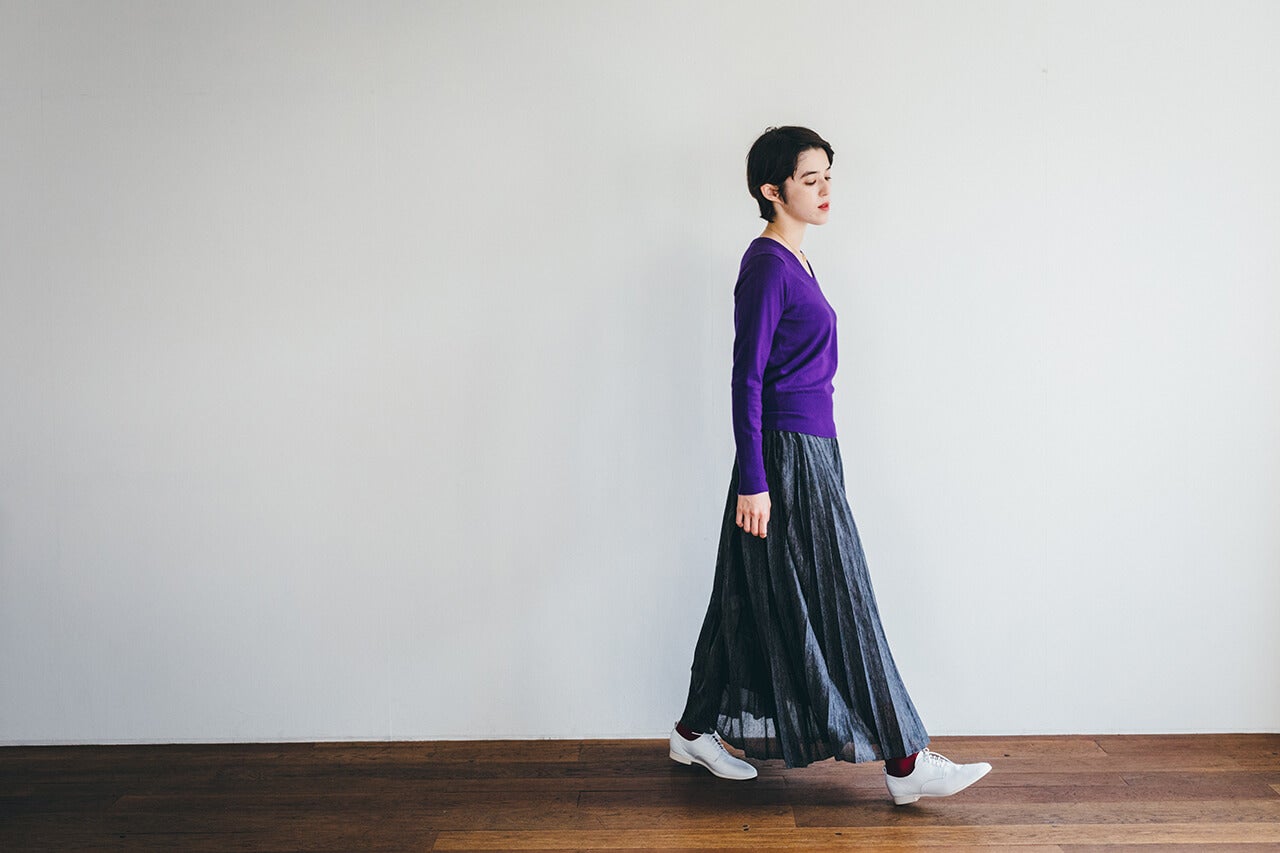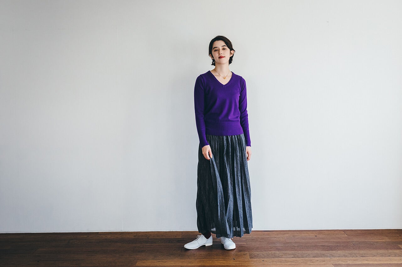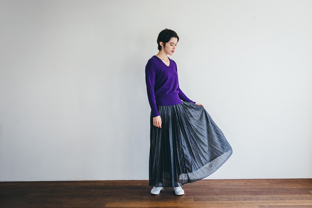 長めのリブは、腕や腰まわりをすっきりと見せます。
