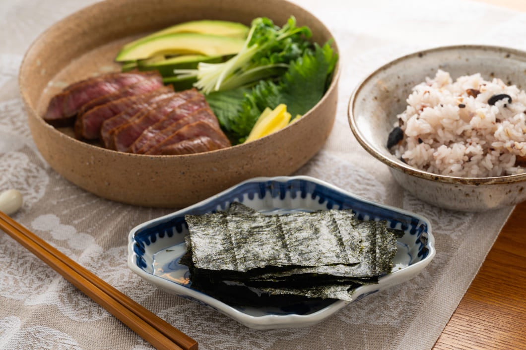 器に盛り、白ごまとちぎった海苔を全体に散らします。