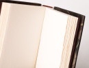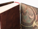 <本体> 台紙:カルトン 背表紙バンド部分:山羊革、羊皮紙 背表紙バンド以外の部分:ヘビ革 花切れ:山羊革 花切れの芯:Batonnet テキスト本文紙:アルシュ・ベラン 見返し紙:マーブル紙 (フランスのマーブル作家 Perry Katalinによるハンドメイドの作品)、 遊び紙:越中染め紙