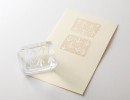 ガラスでできたはんこ。 はんこの柄は、 一点、一点、すべて異なります。 雪の結晶、街の風景、水玉模様など、 作者が思いつくままに、 かわいいと思う柄や、 きれいだと思う柄を掘っています。