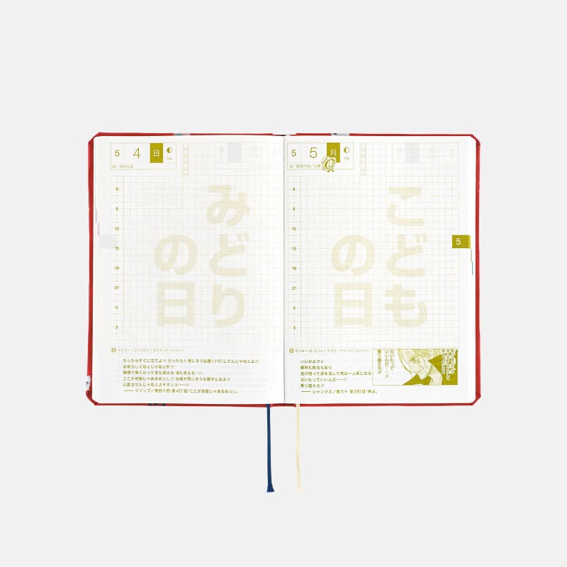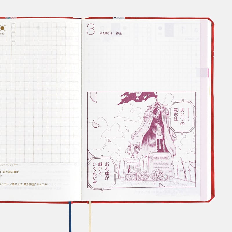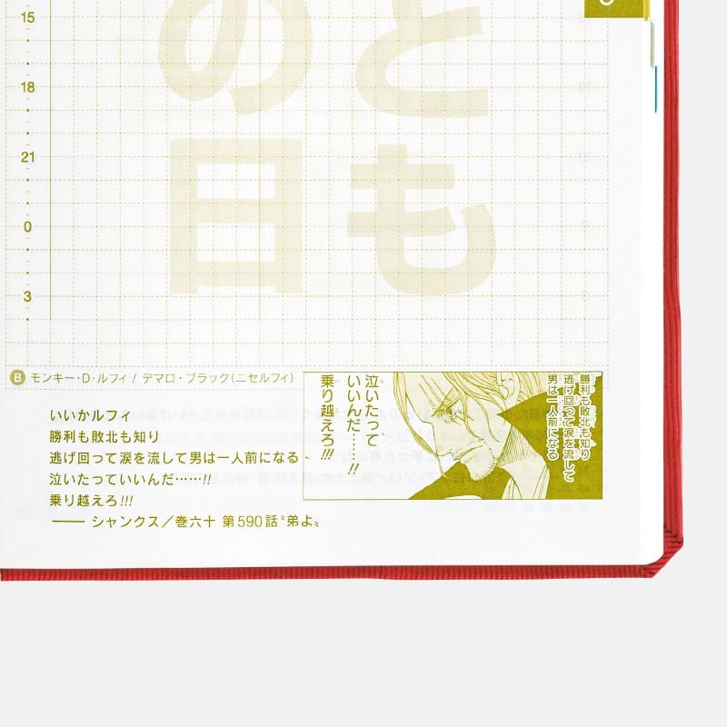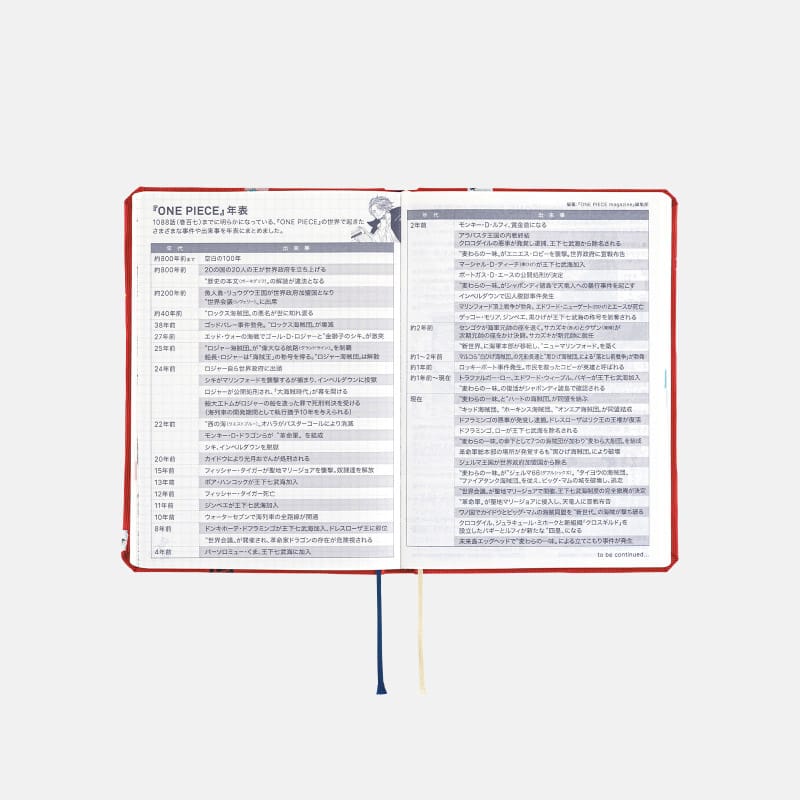■おまけページ: 『ONE PIECE』年表/ここぞのときに使いたい『ONE PIECE』の言葉/何度でも見たい、読者が選んだ名シーン10選/WANTED/Time Table/Favorites/My 100/二十四節気のこと/もしものときの、準備をしよう/Gifts/満年齢早見表/Addresses (for 6 people)/Personal Notes