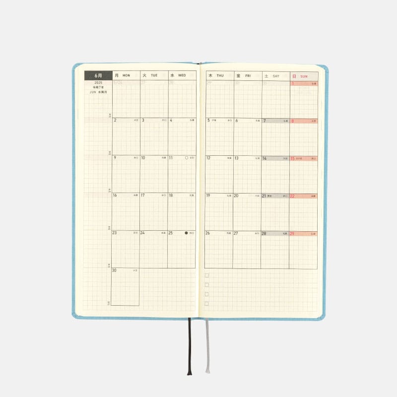■記載される内容:週番号/六曜(大安、仏滅など)/二十四節気(立春、春分、夏至など)/祝日、記念日など(バレンタインデー、ひなまつり、母の日、父の日など)/月の満ち欠け(週間ページ全てに記載・月間カレンダーに満月と新月のみ記載)