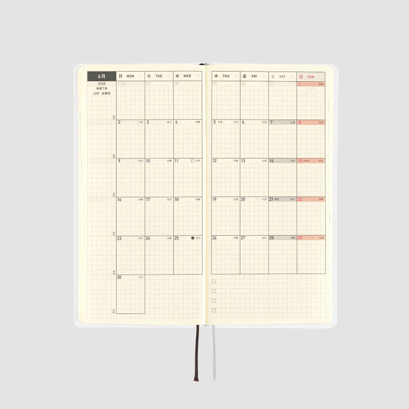 ■記載される内容:週番号/六曜(大安、仏滅など)/二十四節気(立春、春分、夏至など)/祝日、記念日など(バレンタインデー、ひなまつり、母の日、父の日など)/月の満ち欠け(週間ページ全てに記載・月間カレンダーに満月と新月のみ記載)