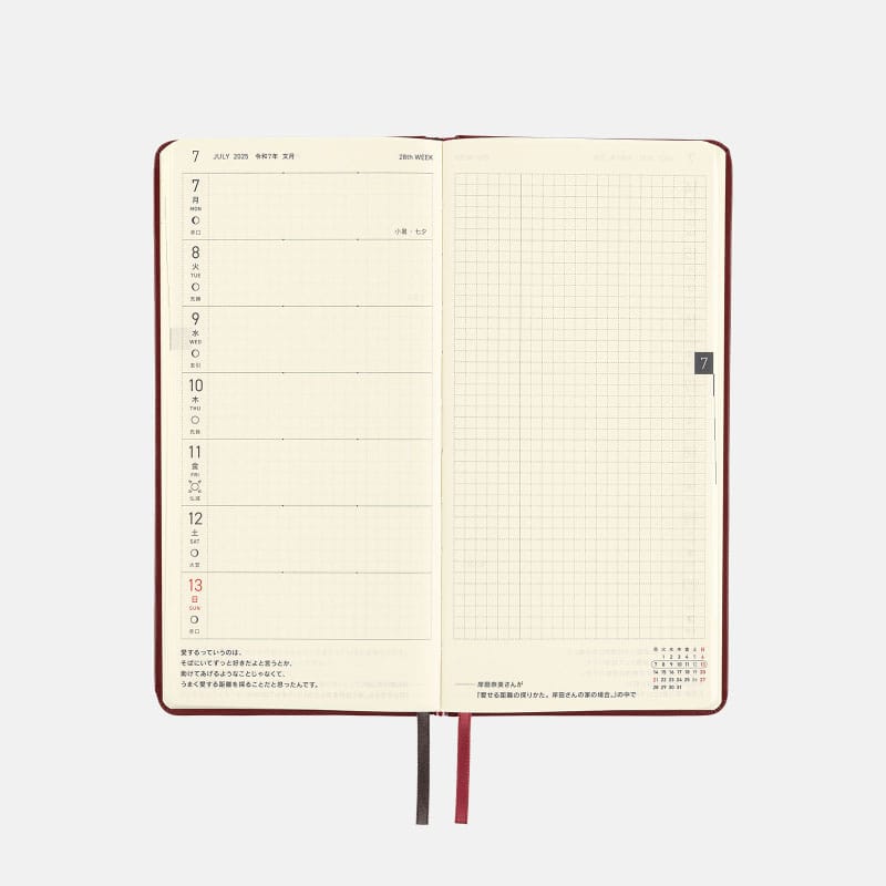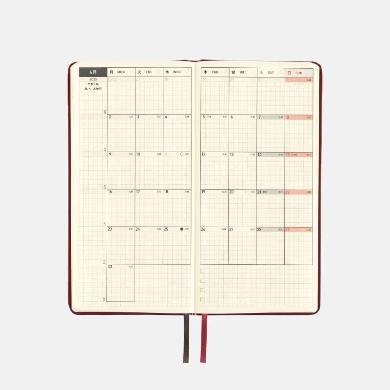 ■記載される内容:週番号/六曜(大安、仏滅など)/二十四節気(立春、春分、夏至など)/祝日、記念日など(バレンタインデー、ひなまつり、母の日、父の日など)/月の満ち欠け(週間ページ全てに記載・月間カレンダーに満月と新月のみ記載)