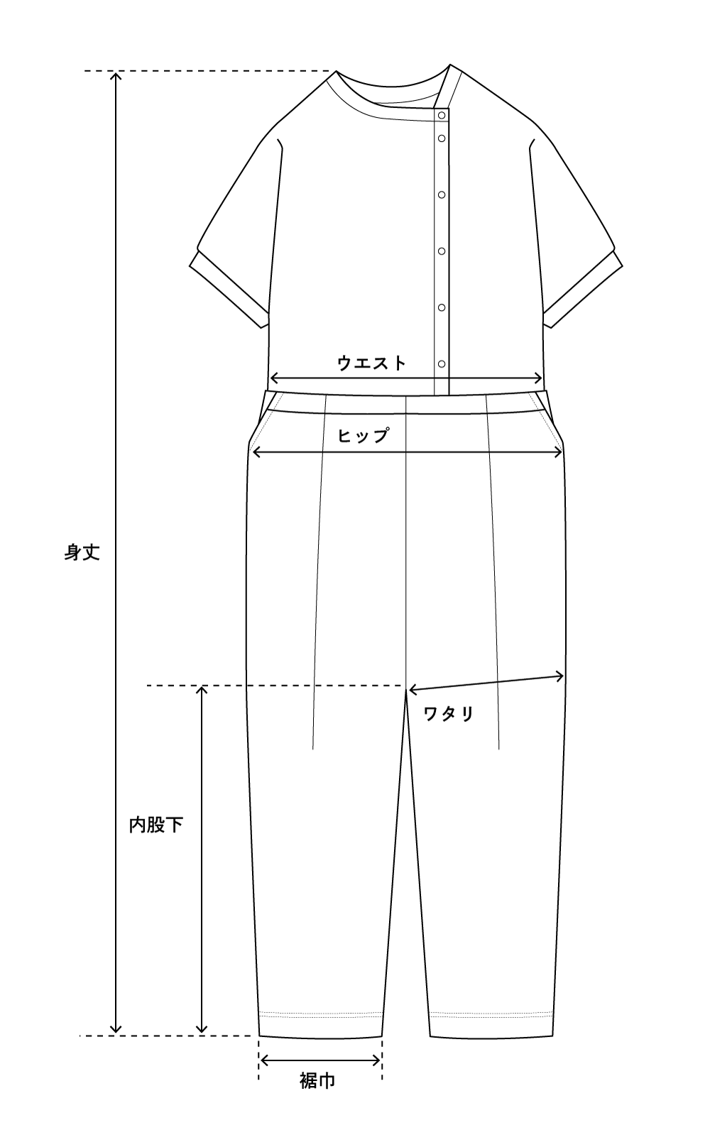 ウエスト100、ヒップ115、ワタリ35.8、内股下61、裾巾20.5、身丈137