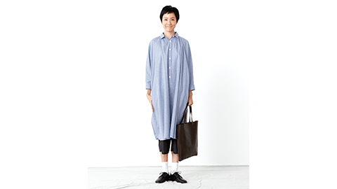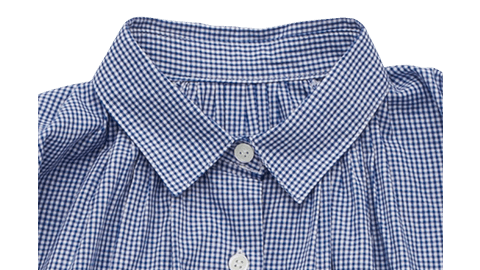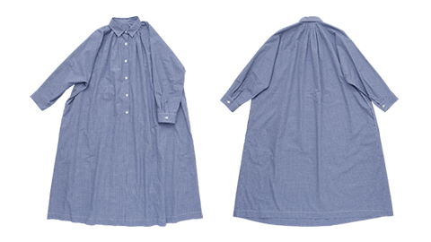 さわやかな白と青。小さな襟、台襟がきちんとついた襟もとの前後の身頃に細かいタックが入っています。裾に向かって、きれいなドレープをつくりながら、 たっぷり、ふんわりとひろがるシルエットです。このワンピース、肩の位置が自由なラグラン袖ですが、袖つけがちょっと不思議。前から見ると袖つけの縫い目がありません。前身頃から袖ぜんたいが、一枚の布で包まれて、縫い目は後ろ身頃に。だから、ギンガムの柄が途切れることなく、きれいに続いているのです。