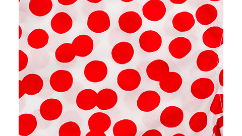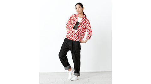 白地に、元気な赤。踊るようなランダムなみずたまの布地は、大橋さんがひとつひとつ切り絵をして、並べ、デザインしたオリジナルプリントです。シャツのかたちは、オーソドックス。ほどよい大きさの角襟で、台襟もあり、肩ヨークもついています。裾はゆるやかにカーブがあって、ボトムにインでも、アウトでも。タイトめに着ても、大きめのサイズをゆったり着ても、どちらもカッコよく決まります。布は薄手で肌触りのよい、上等なブロードです。