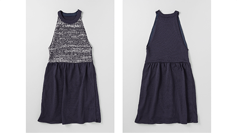 軽い着ごこちの、ニットのワンピースです。前身ごろにプリントされた文字はイギリスはヴィクトリア朝時代の小説家、チャールズ・ディケンズの小説「クリスマス・キャロル」の草稿から。「ワンピースはいろいろつくってきましたが、これははじめてのかたちです。脇が大きく開いているのでゆったりしていて、着やすいと思います。下には、白いシャツでもいいしグレーのハイネックのカットソーなんかにも合わせてみたいですね」(デザイナー渡邉良重)