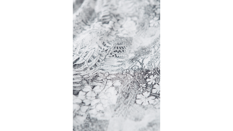 春夏で反響の高かった、ラグランのブラウス今秋冬では、長袖バージョンが登場。「前回、とても着やすかったので、秋冬も着たいなと思ってつくりました。グラフィックはふるい図鑑にあるような植物の絵柄を描いたり組み合わせたりしました。襟元にはギャザー、着たときに裾が広がるシルエットです。秋冬なのでタートルネックを合わせてもいいかもしれませんね」(デザイナー渡邉良重)
