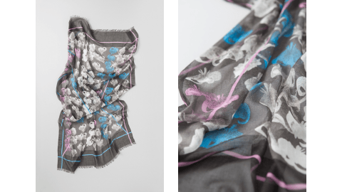 大きくて、軽くて、あたたかい。一年を通じて大活躍の大判ストール。極細の糸を使用しているため軽くて、たたむとかなりコンパクトに。一年中、カバンに入れて持ち歩けます。秋冬シーズンだけでなく、冷房の効いた部屋や飛行機の中など重宝する場面は、予想以上に、たくさん。「今回は、ユリのモチーフです。そこへ、青とピンクのラインを入れてデザインを締めました。個人的には今回のデザインが、いちばん好きかな。1枚1枚手刷りでプリントしています」(デザイナー渡邉良重)