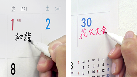 水拭きで簡単に消せる固型マーカーです。「ほぼ日ホワイトボードカレンダー」は、裏面もホワイトボード仕様になっているので、お子さんのお絵かきや、家族や職場で掲示板にしたりするときにいかがでしょう?消すときは、ティッシュや柔らかい布を水で濡らして拭き取ってください。