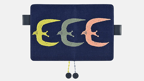 翼を大きく広げた3羽の鳥が連なる「go!」。手描きの図案をもとにした刺繍のカバーです。鳥の目や、羽の向きに沿ったカーブの部分など、細かなところにまでていねいな仕事のぬくもりが感じられます。ベースの生地は、目の粗いざっくりとしたリネンで内側やバタフライストッパーには少し光沢のある明るい紺色の合皮を合わせました。ぽこぽことした立体感のある2色のしおりひもは、刺繍の技法で作られた特別なもの。「ミナ ペルホネン」の世界を刺繍ならではの立体感や手触りとともにたのしんでいただけるカバーです。
