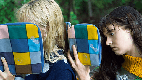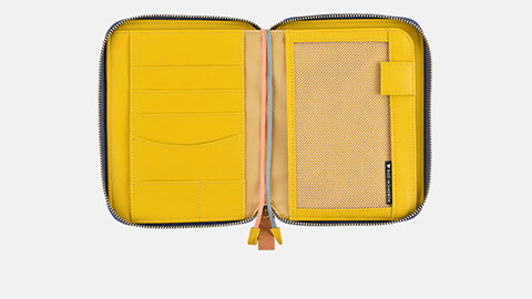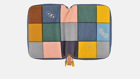 甘いジェリーが並んでいるようなカラフルな格子柄とちょうちょの刺繍を組み合わせたまさに「ミナ ペルホネン」らしいカバーです。生地は、9色のインクを1色ずつ丁寧に重ねながら、手間ひまかけてプリントしたもの。そのため、隣り合う色どうしの微妙な重なり具合などに、手作りならではの味わいを感じられます。内側はきれいなマスタードイエロー。ヌメ革の引き手につけたちょうちょのカシメもポイントです。