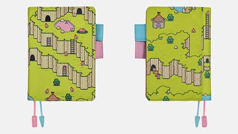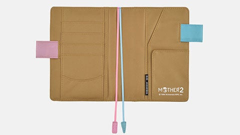 糸井重里がシナリオを手がけた1994年発売のスーパーファミコン用ソフト『MOTHER2 ─ギーグの逆襲』のコラボレーションカバーです。どせいさんの村「サターンバレー」に到着したときの村のようすがカバーになっていて、たくさんのどせいさんのほか、ネス、ポーラ、ジェフの姿も見つけられます。バタフライストッパーは温泉のピンクと、池の水色。内側は明るいブラウンで、端には『MOTHER2』のロゴが白でプリントされています。ゲームプレイ中のわくわくする気分が思い起こされるようなカバーです。ちなみに外側のポケットの中には「つっぱりダック」が隠れています。