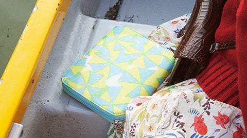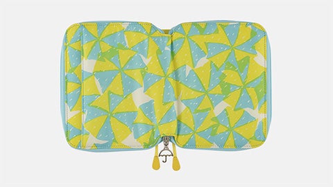 オーダーメイドの傘を手がける「イイダ傘店」の傘生地を使ったジッパーズです。イイダ傘店が生み出すテキスタイルは、植物や食べ物、動物柄など多彩。オリジナルでは、その中のコレクション「スクランブル」の柄を選びました。