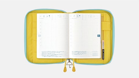 しおり(2本)/ペンホルダー(1つ)/カード用ポケット(3つ)/スマイルポケット(1つ)/小さなポケット(1つ)/大きなポケット(1つ)/メッシュポケット(1つ)/特大ポケット(1つ)/外側ポケット(1つ)