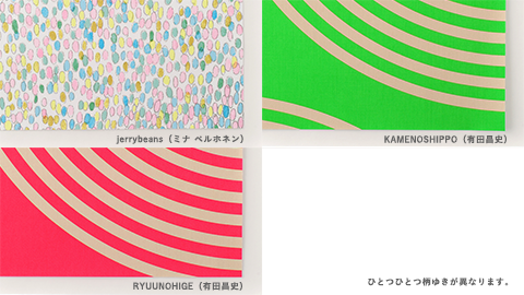 - 「jerrybeans(ミナ ペルホネン)」「RYUUNOHIGE(有田昌史)」「KAMENOSHIPPO(有田昌史)」は、おおきな柄ゆきの生地を裁断しているため、柄の出方がひとつひとつ異なります。あらかじめご了承ください。