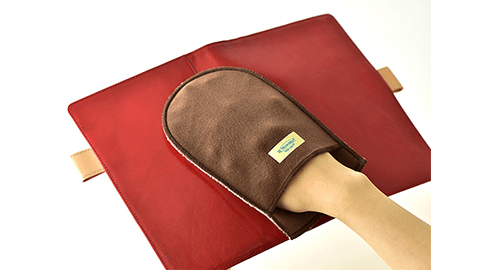 手袋型の乾ぶき用クロスです。手を汚さず、最後の仕上げ(ツヤだし)ができます。高級感のある綿スエード地とソフトなフリース素材でできていて、使いごこちもなめらかです。