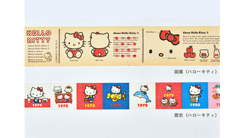 ほぼ日手帳2016の手帳カバーとしても『トリコロール』、『ポルカドット』が登場しているハローキティをモチーフにしたマスキングテープです。歴代のキティが年号とともにずらりと並ぶ赤、白、青が基調の「歴史」(幅20mm)とマスキングテープ自体が英語のハローキティ図鑑になっている「図鑑」(幅30mm)の2種類です。どちらもさまざまな柄をたのしめるのが特長です。「Hello Kitty 70’s」の手帳と合わせて使っても、かわいいです。