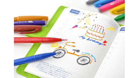 筆ペンのようなタッチで書ける水性カラーペンです。鮮やかな発色の水性染料カラーインキは、手帳のような薄い紙でも裏写りせず、比較的乾きやすいのが特徴です。書き心地もなめらかで、字やイラストの線に簡単に強弱をつけることができます。使い始めは固く感じられるかもしれませんが書いていくうちに、先が筆のようになっていきます。カラフルな「明るめ5色セット」と、落ち着いた色味の「渋め5色セット」に加え、ことしからは、使い勝手のいい「ブラック」もお選びいただけるようになりました。