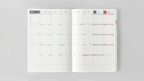 スペースがたっぷりある「1日1ページ」タイプ。書きやすさを追求して行き着いた「3.7ミリ」の方眼は、印刷を薄くしてあるので、マス目を気にせずに使うこともできます。予定を書くだけではなく、写真やチケットを貼ったり、絵を描いたり、ノート代わりにメモしたりするなど、自由に使えるのが特長です。