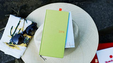 シンプルながら個性的な5色の「カラーズ」。ザラッとした手触りの表紙にはドイツの書籍装幀用の生地が使われていて、洋書のような雰囲気をかもし出しています。明るいイエローグリーンの「キウイ」には、表紙の「2016」の文字に元気いっぱいのオレンジを選びました。ビタミンカラーを組み合わせたWEEKSで、この1年を活発に過ごすことができそうです。印象を変えてみたいときには「柄入りクリアカバー」との組み合わせもおすすめ。