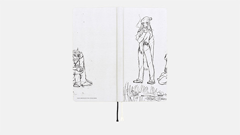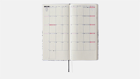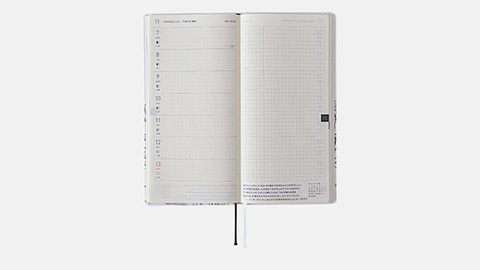 岡崎京子さんのマンガ『リバーズ・エッジ』の鉛筆イラストが表紙になったWEEKSです。デザインは、ブックデザイナーである祖父江慎さん+鯉沼恵一さんの手によるもの。まっ白い布地の裏表紙には男の子も印刷されています。白を活かすため、年号は空押し。しおりは白と黒の2本。見返し模様の「hobo」はわずかに濁ったニスで、淡く印刷しています。また、この手帳には岡崎京子さんの物語集『ぼくたちは何だかすべて忘れてしまうね』の文章が白で印刷されたクリアカバーと、『ヘルタースケルター』のイラストが入った特製の下敷きがついてきます。