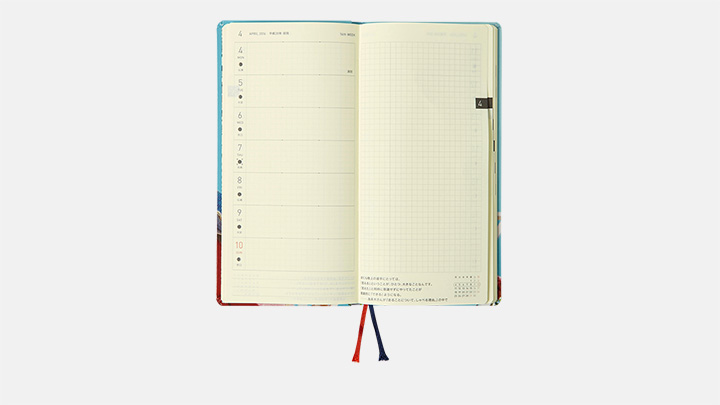 写真家の川島小鳥さんが、佐渡島で出会った女の子を撮影した写真集『未来ちゃん』。「ほぼ日手帳 WEEKS」の表紙として、写真集には収録されていない、はじめての海外旅行に出かけた「未来ちゃん」の写真を使用しています。写真集のような装丁にするために、表紙には光沢のある表面加工をして、「2016」の年号も空押しにしました。「バラと空」の表紙で使用している写真は、気持ちよく晴れたパリの空の下、上品に咲くバラの花に息を吹きかけて飛ばす「未来ちゃん」が遊んでいるようすで、表紙から裏表紙にかけて、一枚の写真になっています。表紙と裏表紙の見返しにも海外のカフェとレストランにたたずむ写真をプリントし、写真集を持ち歩けるような手帳です。そして、特典の下敷きには佐渡島で撮影した、夏と冬の写真を収録しています。しおりは、赤と青の2色です。おかっぱ頭に、真っ赤なほっぺ、天真爛漫な表情を浮かべる「未来ちゃん」がいつでもそばにいてくれるような手帳です。