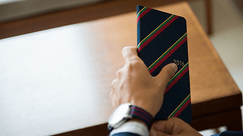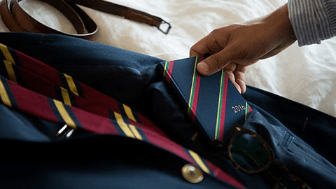 ネクタイ生地をWEEKS用に仕立てた「タイ&チーフ」シリーズ。ネクタイ生地を使っているため凹凸の肌触りが心地よく、光沢の美しさが特徴です。スーツやシャツとの相性がよく、ビジネスシーンにもなじみやすいWEEKSです。「レジメンタルストライプ」は、イギリス海兵隊「Royal Marines」の連隊旗をモチーフにした正統派のデザイン。光沢感のあるネイビーをベースに、赤、緑、黄色のラインが入ったストライプで、折り目正しい印象のWEEKSです。