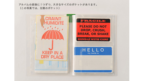 ほぼ日手帳オリジナルにはさむのにちょうどいいサイズの、名刺やショップカードなどをまとめておけるアルバムです。16個あるカードサイズのポケットにカードを背中あわせで2枚ずつ入れることで、最大32枚のカードが入ります。また、アルバムの前後に1つずつ(計2つ)大きなサイズのポケットがあり、規格の異なる大判のカードなどを入れておくことができます。