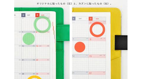 手帳カバーのポケットに入れて持ち運べる、「リング」と「まる」のフィルムふせんのセットです。オリジナルやカズンの手帳の月間スケジュールのマス目に貼るのにちょうどいいサイズの2種類のふせんが各4色ずつ入っていて、便利に使うことができます。半透明で、書いた文字の上から貼れるほか、ふせんの上にさらに文字を書くこともできます。何度も貼ったりはがしたりできるのも特長。大切な予定を目立たせたいときや、ページをデコレーションしたいときに役立ちます。