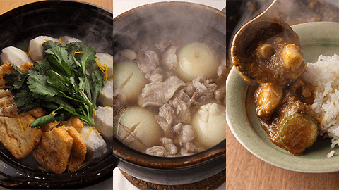 伊賀・土楽の福森道歩さんの第二作となる土鍋料理の本ができました。第一作の『スゴイぞ!土鍋』が、ベア1号&2号を初めて使う方向けのベーシックな教科書だとすると、この『土鍋だから、おいしい料理』は、さらにレパートリーが広がるレシピと土鍋使いのコツがたくさん紹介された、「土楽の土鍋を使う人、必携の副読本」です。本書には、ひとりでもたのしめる「おつまみと軽いおかず」から、大人数でわいわいいただく四季折々の食材を使った鍋やスープ、炊き込みご飯やピラフなどのごはん炊きなど主要42品に、手づくりのお揚げ料理、伊賀の里山の食材を使った料理など、約50レシピを掲載しています。和食はもちろん、イタリア、フランス、中国、韓国、インド‥‥と、世界を旅する土鍋料理の本でもあります。