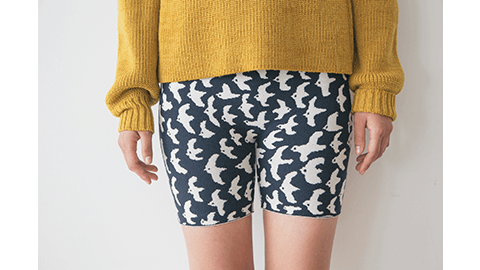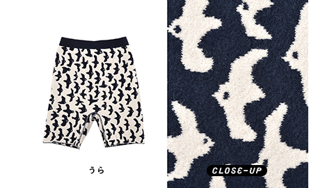 塩川いづみさんによる紺地に、白いトリが群れで飛んでいるような柄。トリの中には、おばけのような形の子や、みんなと逆方向に飛んでいる子が、1匹だけいます。とってもかわいいですよ。